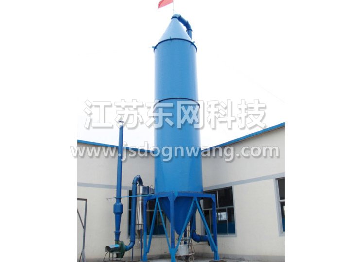 本机组工作过程为料液通过隔膜泵高压输入,喷出雾状液滴,然后同热空气并流下降,大部分粉粒由塔底排料口收集,废气及其微小粉末经旋风分离器分离,废气由抽风机排出,粉末由设在旋风分离器下端的授粉筒收集,风机出口还可装备二级除尘装置,回收率在96-98%以上。