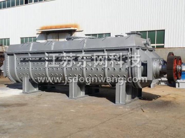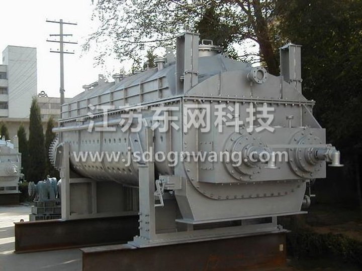 空心轴上密集排列着楔型中空浆叶,热介质经空心轴流经浆叶。单位有效容积内传热面积很大,热介质温度从-40℃到320℃,可以是水蒸汽,也可以是液体型:如热水、导热油等。间接传导加热,没有携带空气带走热量,热量均用来加热物料。热量损失仅为通过器体保温层向环境的散热。楔型浆叶传热面具有自清洁功能。物料颗粒与楔型面的相对运动产生洗刷作用,能够洗刷掉楔型面上附着物料,使运转中一直保持着清洁的传热面。浆叶干燥机的壳体为Ω型,壳体内一般安排二到四根空心搅拌轴。壳体有密封端盖与上盖,防止物料粉尘外泄而充分发挥作用。