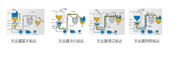 密相气力输送主要分为:发送罐(或称仓泵)基本输送、发送罐流化输送、发送罐增压输送、发送罐满载输送、发送罐上引输送